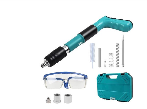Pachetul conține pistolul de cuie, cuie rotunde, echipament de protecție, unelte de curățare și instrucțiuni de utilizare.